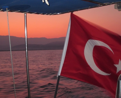 As the sun sets, we anchor in a peaceful nearby bay for the night, ending another unforgettable day on the turquoise waters of the Turkish coast.